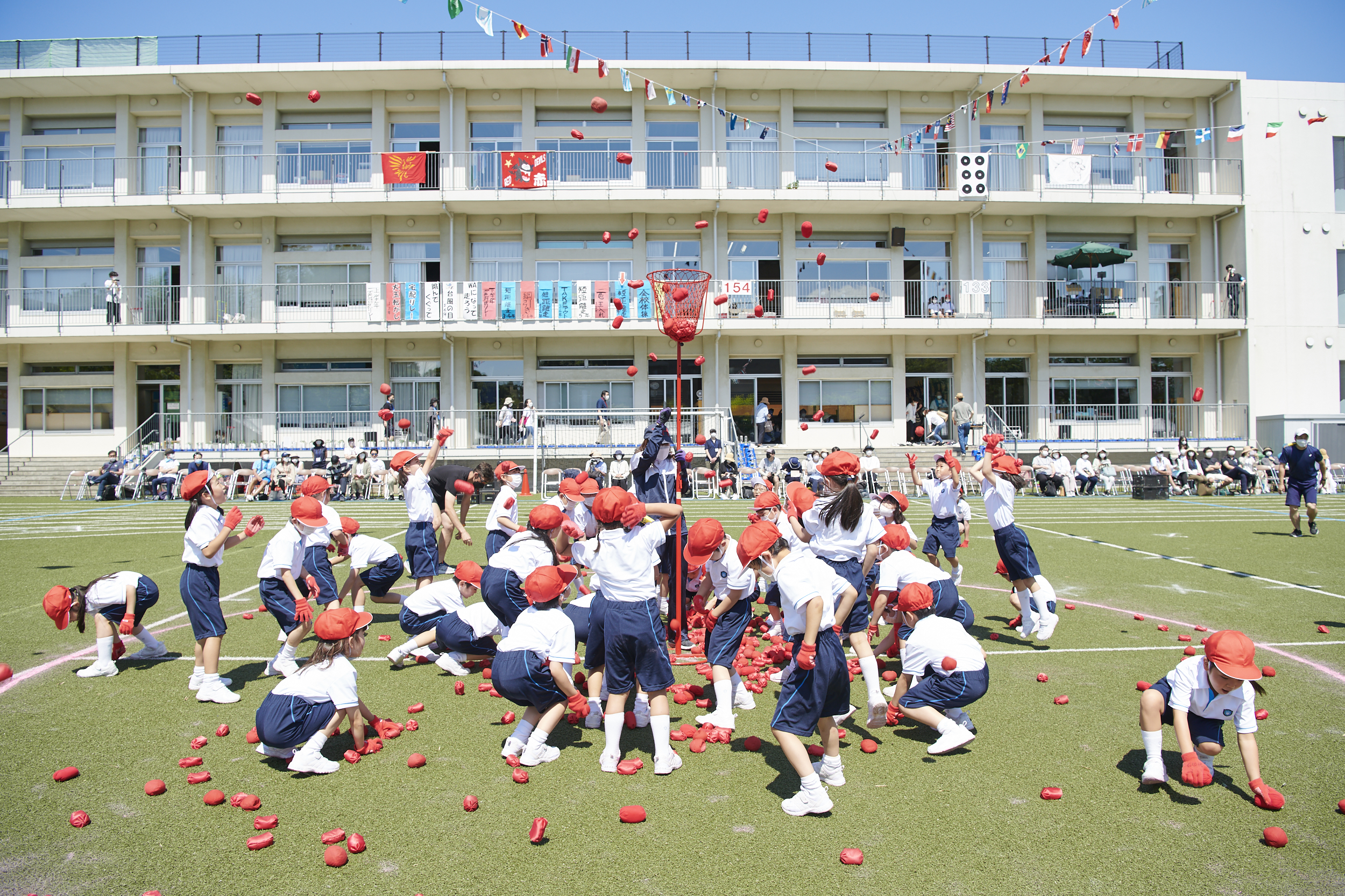 学年縦割りで赤・白の2色に分け、得点を競います。