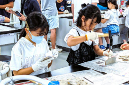 当日のテーマは「化石ってなんだろう 触ってみよう! 調べてみよう!」で、この分野では超有名な東京都市大学理工学部自然科学科准教授 中島保寿先生と先生の研究室の学生さんにより講義と実習が行われました。30名を超える子どもたちが参加しました。講義の後、採取した岩石を実際にハンマーなどで割って、植物の葉や虫などの化石を見つけるという体験もして、あちこちで化石が出るたびに歓声が上がっていました。