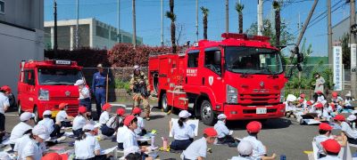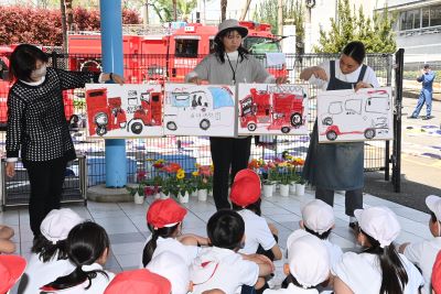 付属小学校の駐車場で消防署のご協力により、3年生が消防車の写生をしました。