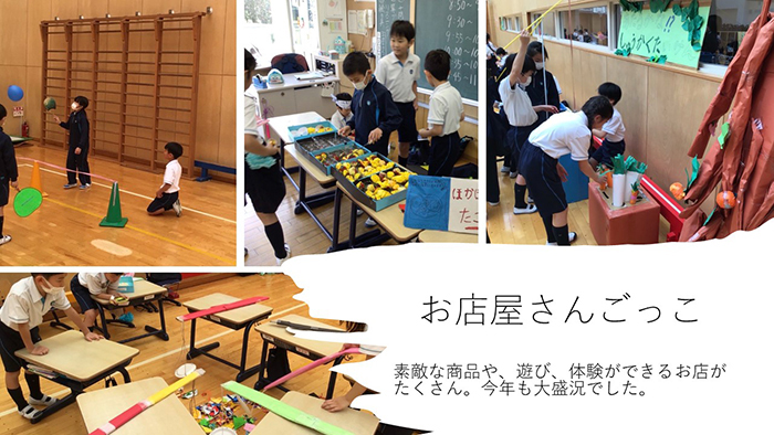 1年生のお店では、ドキドキできる紐たどりゲーム、ビックリ箱屋さんがあり、ちょっとカフェで一息ついて…。綺麗なアクセサリーや昭和のおもちゃ屋さんでお買い物。ペット屋さんやお化け屋敷では不思議な生き物に出会うことができました。クレーンゲーム、ボウリングでは豪華な景品をもらい、収穫体験もすることができました。