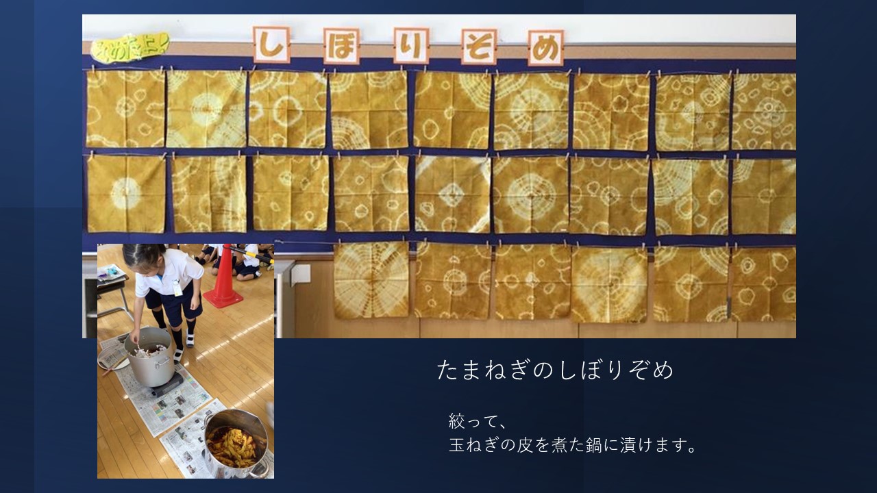 子どもたちが集めた玉ねぎの皮で、絞り染めをしました。