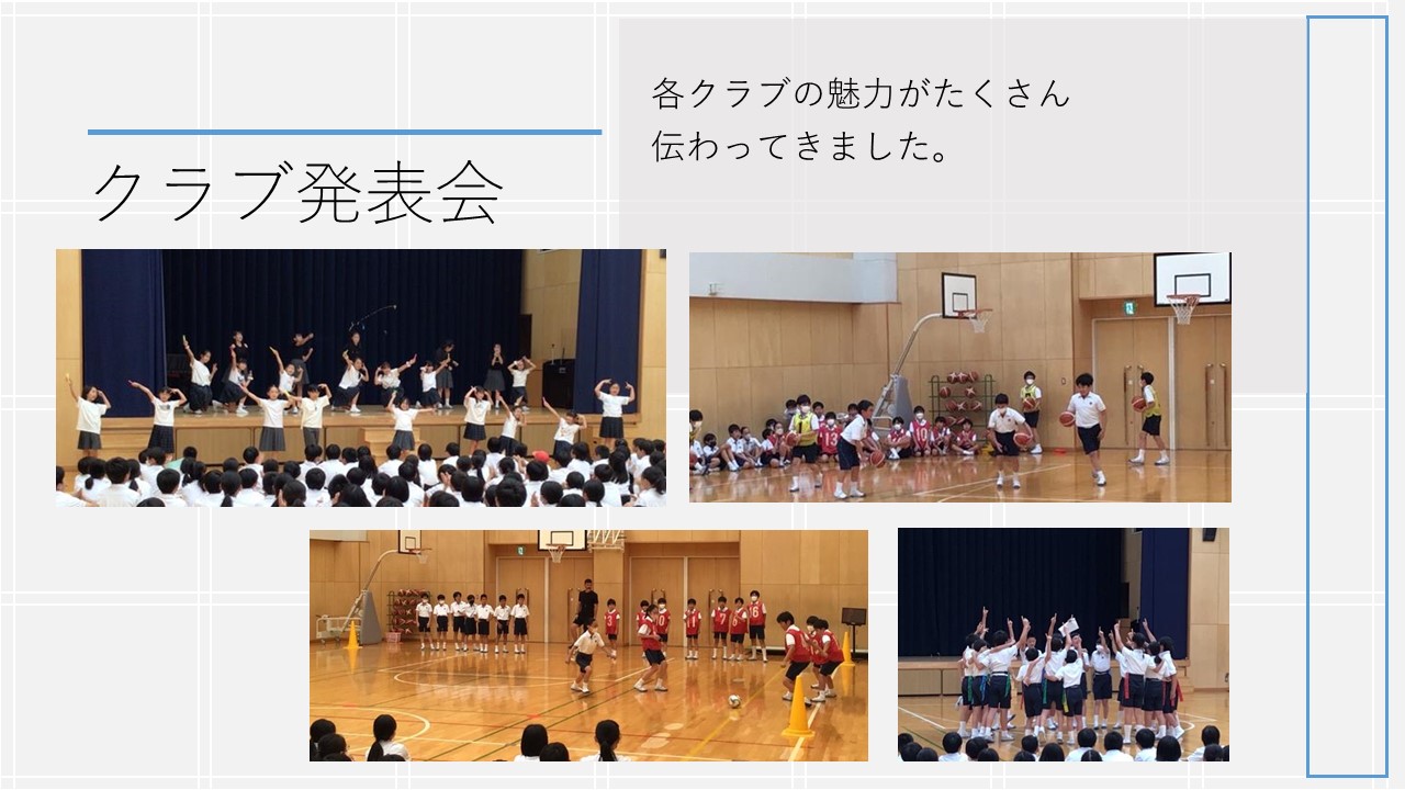 上学年によるクラブ発表会が行われました。演奏、ミニ試合、ダンスの発表、活動報告など、普段の活動の様子や魅力が沢山伝わってきました。後期はどのクラブに入ろうか、とても参考になりましたね。