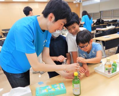 小学校からは4・5年生の子どもたちが参加し、同大学理工学部応用化学科・江場宏美教授のご指導のもと、水素を発生させてLED電球を光らせる実験を行いました。科学を学べば、ありふれた素材・道具からエネルギーを生み出せることに驚き、科学技術や環境問題への考えを深める大きなヒントを得ることができました。