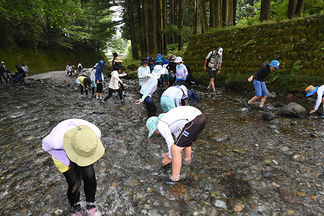 午後は、湧水の恵みウォークに出かけました。富士山麓に降り注いだ水が湧き出し、滝となって流れる川の中を歩きながら水生昆虫を探したり、魚やカニを見つけて沢を登り、マイナスイオンたっっぷりの滝を堪能しました。