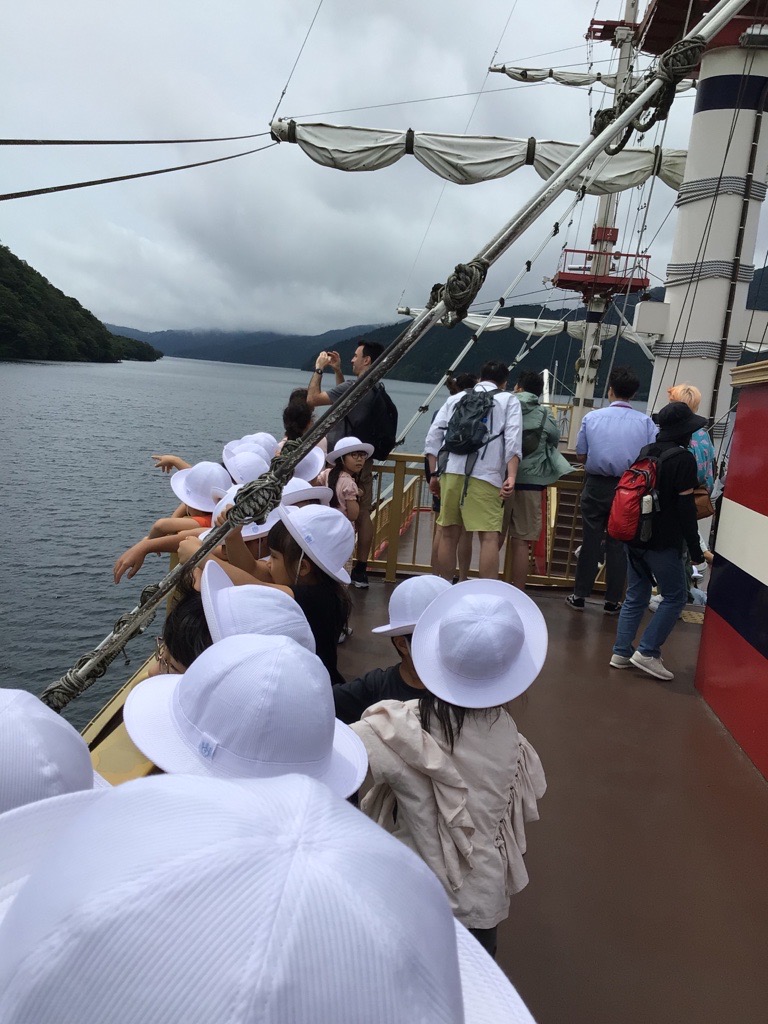 海賊船に乗り、芦ノ湖を遊覧しました。昨日のハイキングの時は上から眺めた芦ノ湖が船上からは海のように広がっていました。