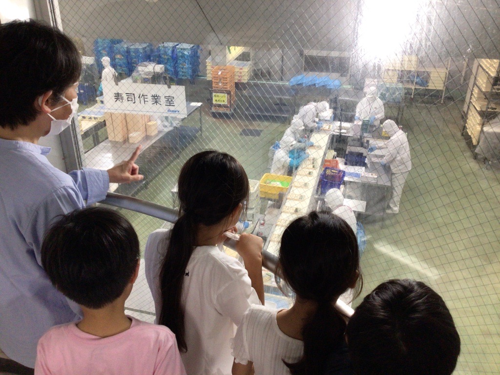 老舗駅弁の東華軒の工場を見学しました。海が近いため採れた魚を保存できるよう工夫したのが押し寿司駅弁だそうで、また、駅弁の食材は全て冷ましてからお弁当箱に詰めるなど工場の方から教えていただくと、子どもたちはうなづきながら、じっくりと様子をみることができました。工場見学の後は海で採れた魚やわかめ、陸で採れた山麓豚を使ったおにぎり弁当をいただきました。お弁当箱は、知恵や工夫が詰まった玉手箱のようでしたね。