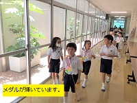 2年生が作ったハート型の花びら4枚でできている四葉のクローバーメダルをいただいてゴール。胸には2年生の心を込めて作ったメダルがキラキラと輝いていました。