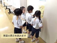 初めて見る教室や施設の前には案内の表示もあり、みんな目を丸くさせてじっくりとお教室を見ていました。