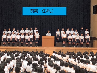 朝、前期の児童会三役、学級委員の任命式が行われました。全校生徒の代表として呼名と共に各委員が一言抱負を述べました。児童会会長は、「少しずつマスクをしない学校生活が戻ってきつつある。これからは笑顔溢れる学校にしていきたい」と、目標をもって勉強した時の達成感のある笑顔、お友達と仲良く遊んだ時の笑顔等、笑顔になれる情景を紹介しながらのお話がありました。