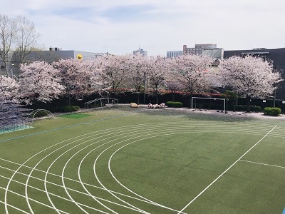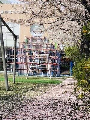 校庭の満開の桜の花が散り始め、桜の絨毯が太陽に照らされてきらきらと輝いています。