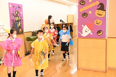 手作りの仮装に身を包み、「Trick or Treat」と言いながら校内をねり歩き、「Happy Halloween」と先生方からお菓子をもらいました。帽子や刀やマント等みんなの工夫がいっぱい詰まった仮装がとても華やかなパーティーとなりました。