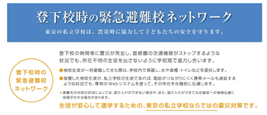 それから、万が一、皆さんの登校時や下校時に大きな地震が発生し、交通機関などが乱れて動くことが出来なくなった時などのために、東京都と神奈川県内の私立小、中、高等学校では「避難校ネットワーク」という、災害に遭った皆さんが逃げこむことが出来るように、安全確保の取り組みを行っています。