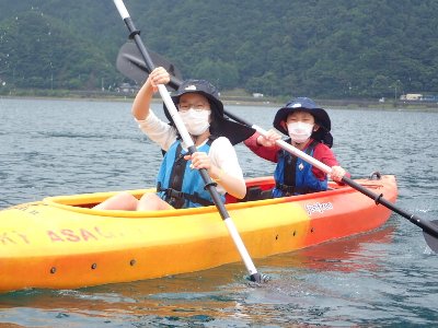 インストラクターさんにパドルでの漕ぎ方を習い、二人乗りカヌーで湖面に漕ぎ出していきました。