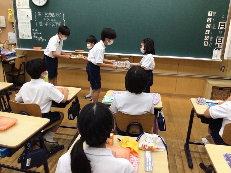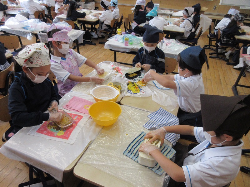 コロナ対策のため、ビニール手袋を着用しての実習となりましたが、梅の色合いや触った感触を楽しむことができました。梅を一つ一つ丁寧にすりおろすとあまーい香りが教室いっぱいに広がり、梅雨の季節を五感で味わいました。完成した梅ジャムは、学校探検でエスコートしてくれた2年生、入学以来着替えや掃除のお手伝いをしてくれている5年生のお兄さんお姉さんに感謝の気持ちを込めて、クラッカーにのせプレゼント。甘酸っぱくて美味しい笑顔に満ち溢れていました。