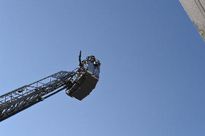 消防車のお話を聞いてから、代表の教員がはしご車に乗って地上30mを体験しました。