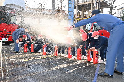 その後急車の説明をしていただき、子どもたちは水消火器での消火訓練を行いました。
