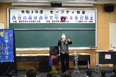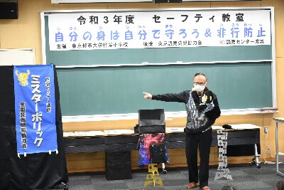 1年は、連れ去り被害防止、不審者への対応(いかのおすし)について、3年には、不審者への対応と非行防止について腹話術や鮮やかな手品を交えてお話しいただきました。