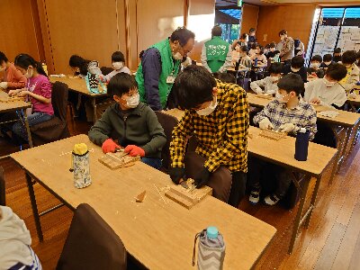 ホテルに到着後、竹細工教室で笛を作っています。