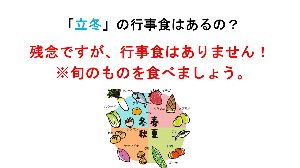 「立冬」には残念ながら行事食はありませんでした。夏の「立夏」でもそうでしたが、季節の旬のものを、季節にあった調理法で食べることで、季節を乗り切ろうというものがありました。「立冬」の場合は、これから迎える寒い時期に、体の温まる温かい料理で備えようということですね。