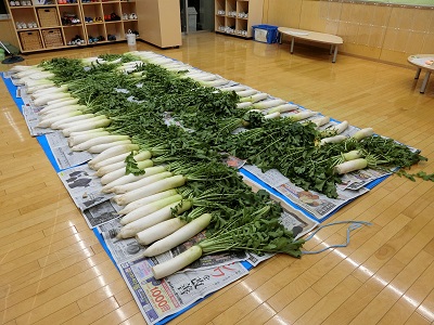 ↓ 下の写真は児童が自分たちで洗ったもの。とてもきれいに洗えています。これを乾燥させてから、「たくあん漬け」に挑戦します。年明けには立派なたくあんをおうちに持って帰れると思います。お楽しみにお待ちください。