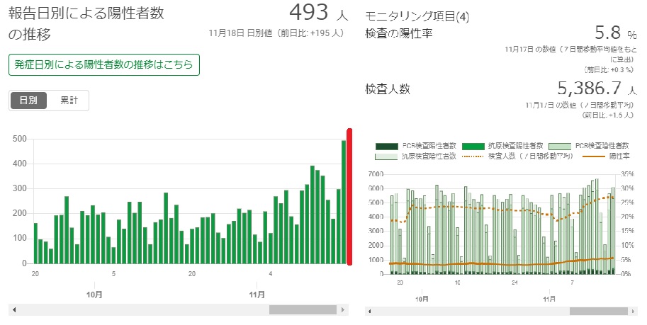 右側のグラフにPCR検査数と陽性率(ともに一週間平均)が示されています。PCR検査数は増えてきておりますが、陽性者率は比例して増えてはおりません。この陽性者率が高まらないことや重症者が増えないことがカギです。感染対策をしっかりとって過ごしましょう。