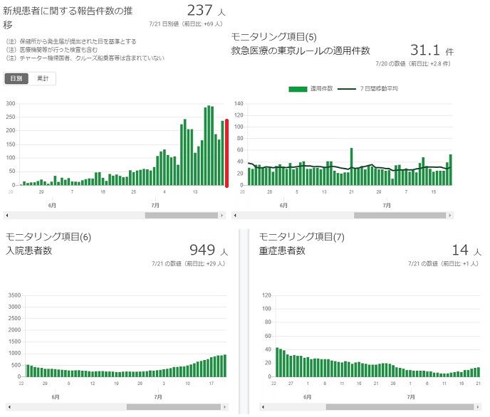 新型コロナの本日の都内新規感染者が238人ということで、二週間連続で三桁(みけた)の数字となりました。大阪も本日、100名を超えたということで、新型コロナの猛威がとどまることを知らない状況です。都知事が明日からの連休期間、外出自粛を呼び掛けていて、致し方のないこととはいえ、観光産業や外食産業には大打撃となります。
