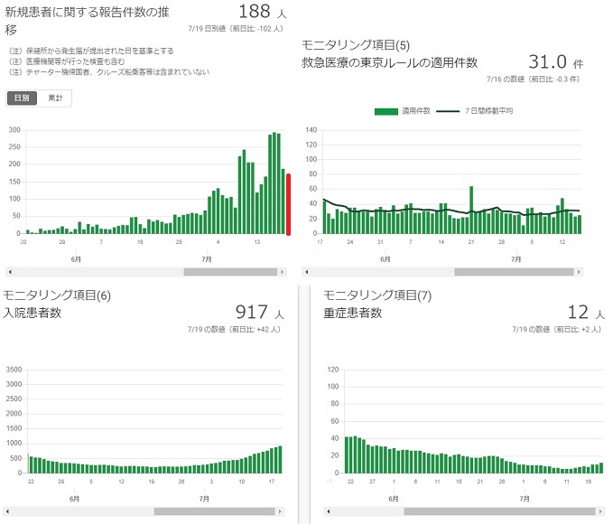 ↓ 本日の都内新規感染者は168人だそうです。2日続きで200人超えではありませんので、何かホッとするような気持ちが湧いてきそうですが、湧いてはいけませんね。200人超えが異常な数字であり、100人超え(三桁)も以上です。はやく2桁(ふたけた)に戻し、一桁(ひとけた)へとつなげなければなりません。