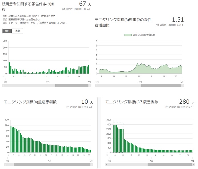 昨日のグラフから「規制強化ないし緩和の目安」の線が消えました。東京都のあらたな方針に基づくものです。新規感染者は増えていますが、重傷者は減り、入院者も横ばいです。でも、7月2日は107名の新規感染者(都内)、100名を超えるのは5月2日以来と言いますから、ますます予防対策をしっかりやらなければなりません。