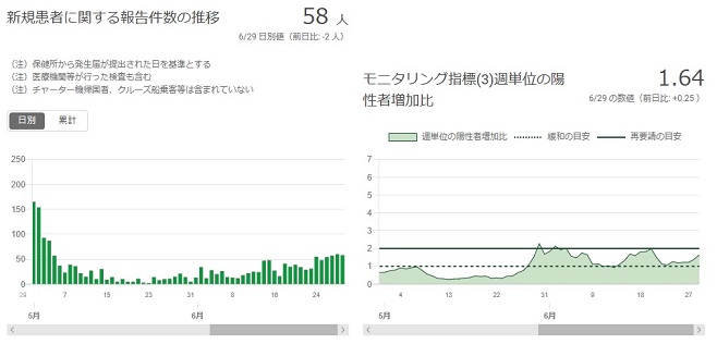 都内新規感染者は昨日の58人に続いて今日も54人と50人超えました。昨日も今日も都内では、亡くなった方の情報がないのがホッとしますが、警戒を要する日々が続いていますので、気を抜かないようにしてまいります。