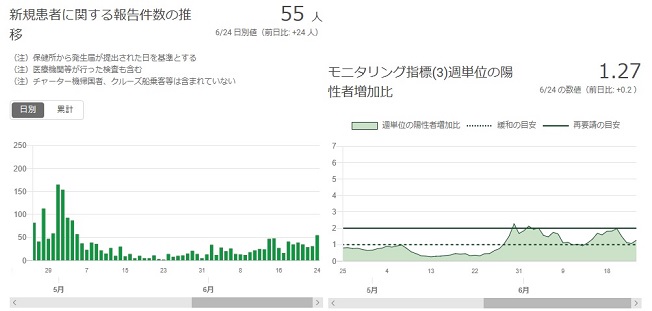 都内新規感染者が昨日は50名超え。一時期、10名台に減少していたのが嘘のような数字となって戻ってきています。きょうも48名と言いますから、心配な数字です。ただモニタリング指標の一つ「週単位の陽性者増加比率」はおととい昨日と「規制緩和水準」ぎりぎりのところなっています。爆発的感染拡大に進まないことを祈ります。