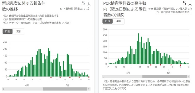 下は東京都ホームページ提供のグラフです。昨日の新規感染者が5名。3月下旬のグラフに近づいてきています。しかしながら、気を緩めないよう国や都、関係方面から再々呼びかけられています。「密」を避ける努力はまだまだ続ける必要があります。6月学校再開ができるよう、お互いに頑張りましょう。