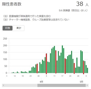 いつものように東京都ホームページ提供の昨日までの感染者推移グラフをご覧に入れます。昨日が38人、今日は23人だったそうですから、これで5日連続で100人を割り込みました。でも連休中で検査総数が少なかったからかもしれません。まだまだ油断禁物です。