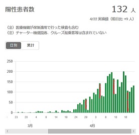 下表は、昨日までの東京都の日別新感染者のグラフです。赤は日曜日。昨日も書いたように油断は禁物ですが、先週より増え方がいくらか収まっているように見えます。緊急事態宣言から昨日で二週間。宣言による人々の行動変容の結果が少しは表れ始めたのかどうか、気になるところです。