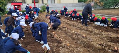 11月6日(水)に2年生が里芋掘りに、7日(木)に1年生がサツマイモ掘りに川崎市高津区の農園へ出かけました。